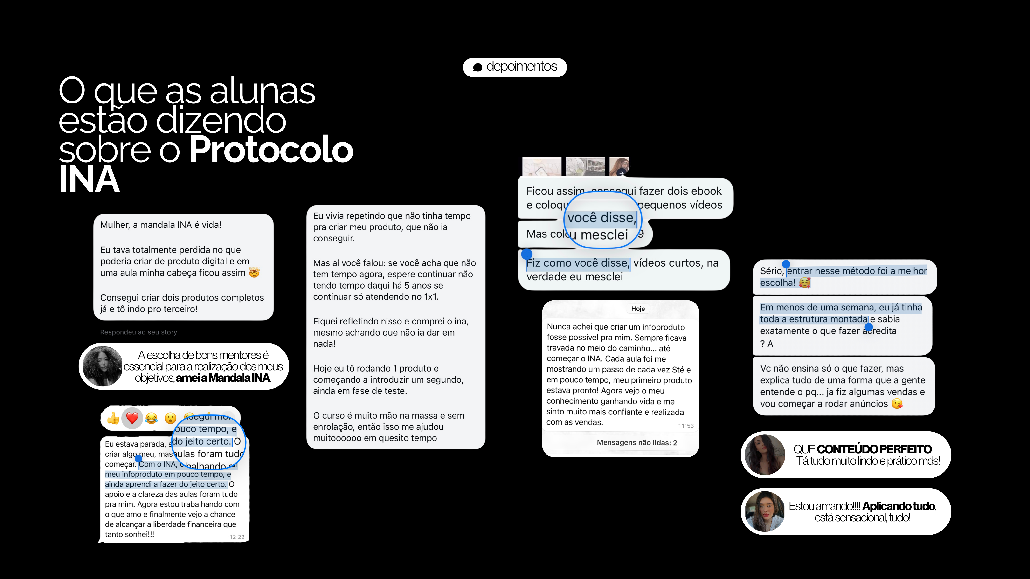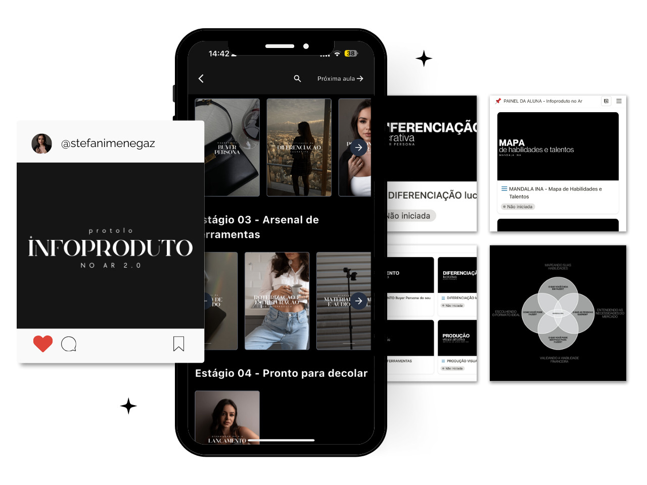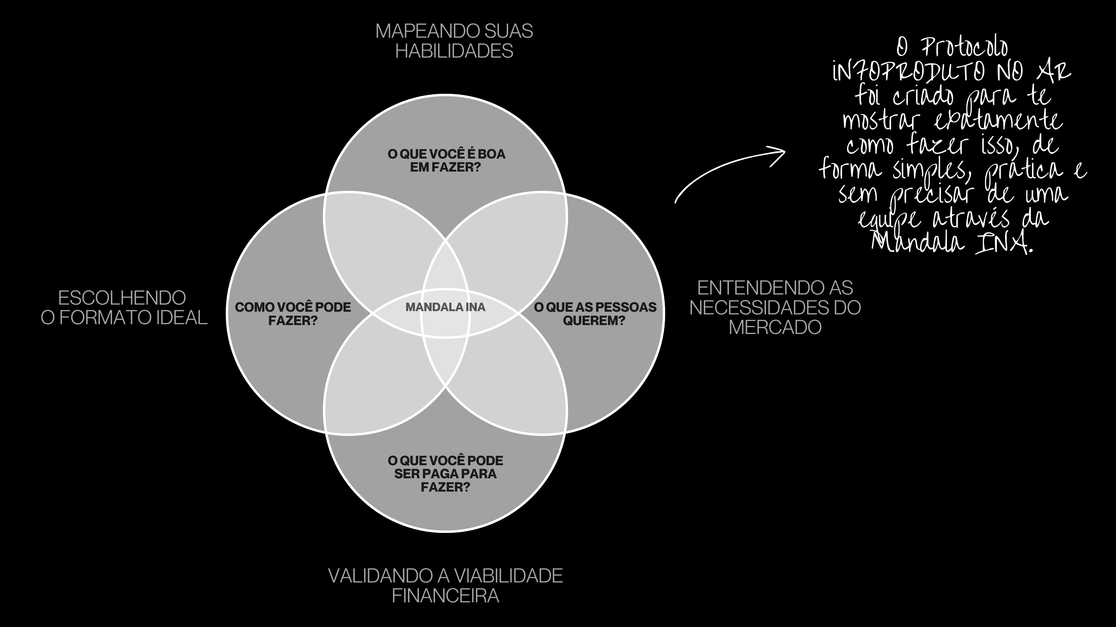 Você vai começar identificando no que você é realmente boa e como isso pode ser transformado em um infoproduto de sucesso. A Mandala INA vai te ajudar a mapear suas principais habilidades e conectá-las com as demandas do mercado.